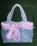 | This basic denim purse with 3 usable pockets in the front and 2 in the back comes with a scarf and pin that can be interchanged with other brooches or scarves. $35.00 (10.5 long x 8 high x 5 wide) | |